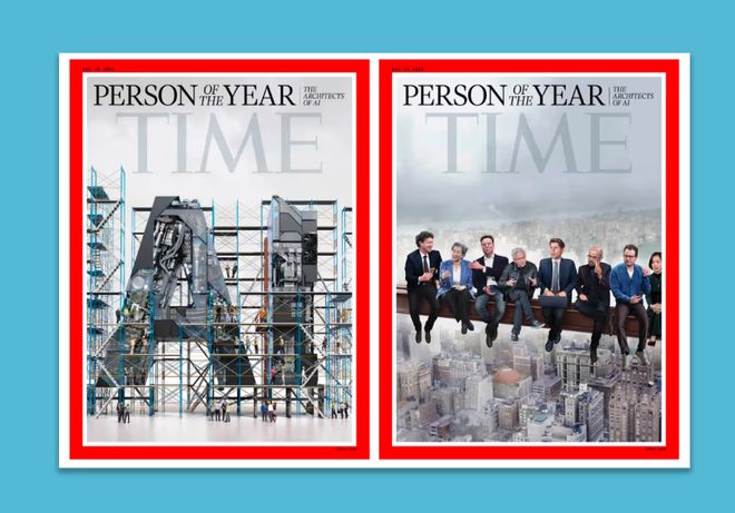 另一幅封面则聚焦当前科技行业的领袖们——八位成功人士坐在横于高空的钢梁上,背景是城市天际线。该设计致敬经典纽约摄影作品《摩天大楼上的午餐》,但将铁匠工人们替换为了科技界人物。